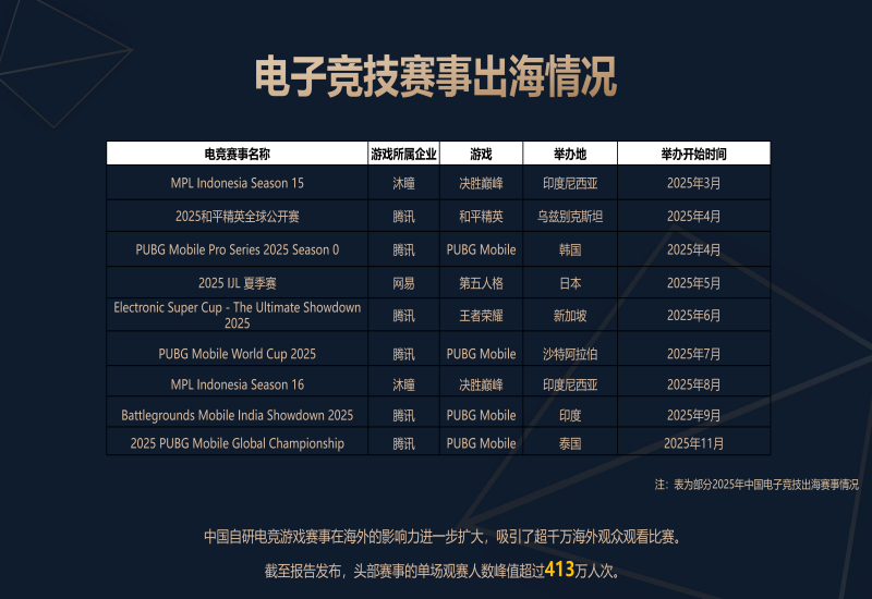 2025年,中国电子竞技产业持续深耕海外市场,进一步巩固了在东南亚、中东和拉丁美洲等地区的市场优势。多款国产电竞游戏产品入选2025年电竞世界杯、2026年亚运会等国际顶级赛事。中国自研电竞游戏赛事的海外影响力进一步扩大,吸引超千万海外观众观赛,头部赛事单场观赛人数峰值超413万人次。