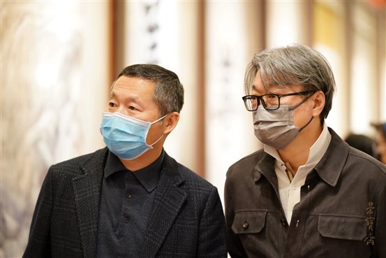 荣宝斋党委书记、执行董事赵东与荣宝斋常务副总经理、北京荣宝拍卖有限公司董事长兼总经理范存刚参观预展现场