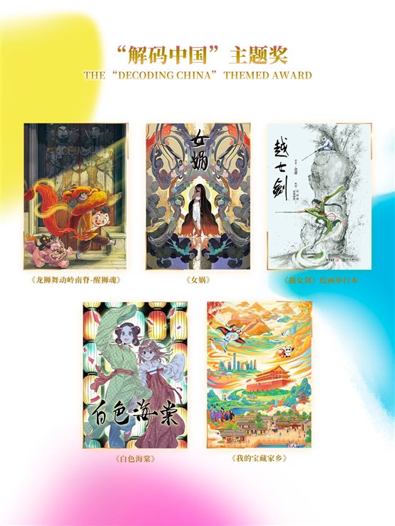 金龙奖当天颁发“解码中国”主题奖、CACC十大动漫奖、CACC十佳潜力动漫奖、CACC海外动漫奖四大赛道的优秀获奖作品。本届漫画节大力弘扬中国文化与中国风格,特别设置了“解码中国”主题奖,鼓励用动漫创意诠释中国文化、社会变迁或未来美好愿景,弘扬中华传统,传承民族力量,同时展望中国发展壮丽蓝图。最终《龙狮舞动岭南脊-醒狮魂》《女娲》《越女剑绘画单行本》《我的宝藏家乡》《白色海棠》五部创新性传承优秀传统文化的佳作获得桂冠。