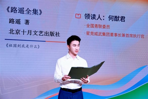 星竞威武集团董事长兼首席执行官何猷君朗诵了路遥笔下饱含深情的《祖国到底是什么》,抒发了青年对祖国的深沉热爱与归属感,凝聚起身后的家国情怀,并号召大家静心阅读、珍惜时光、勇担使命,努力为祖国的发展添砖加瓦。