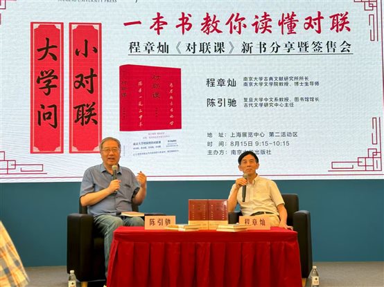 中国出版传媒商报讯 8月15日上午,一场关于“小对联,大学问”的深度对话在上海书展举行。著名文史专家、南京大学文学院教授程章灿携其新作《对联课》,与著名古典文学研究专家、复旦大学中文系教授陈引驰一同亮相活动现场,为读者带来了一场别开生面的新书分享会。两位嘉宾深入浅出地剖析了对联这一独特文学样式的历史渊源、文化内涵与当代价值,让古老的对联在当代的讲授与传承中,焕发新的活力。
