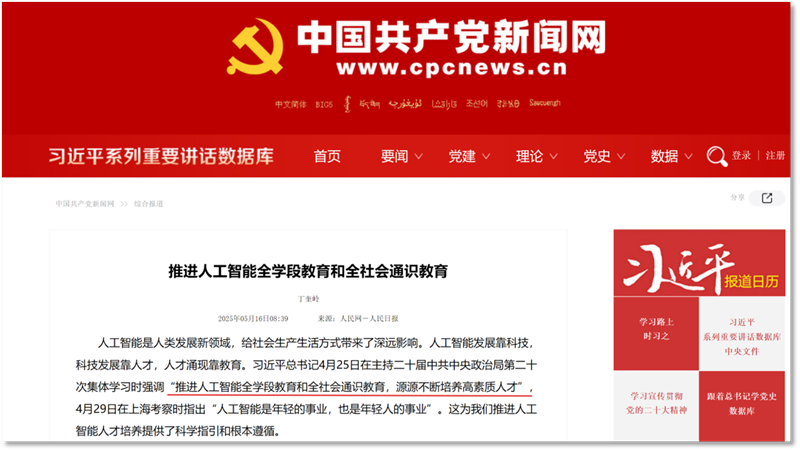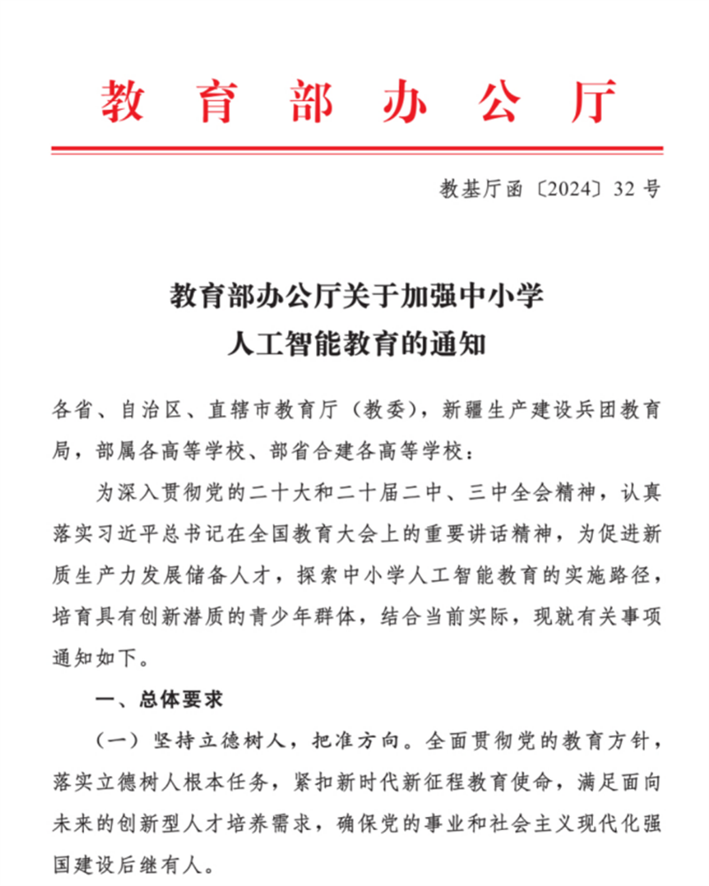 2024年11月以来,教育部先后发布了《关于加强中小学人工智能教育的通知》《中小学人工智能通识教育指南(2025年版)》,为全国人工智能教育发展提供了政策指引。2025年4月,习近平总书记在主持二十届中共中央政治局第二十次集体学习时强调,要“推进人工智能全学段教育和全社会通识教育,源源不断培养高素质人才”,更将科技人才培养提到了战略性高度。2026年1月,全国教育工作会议进一步指出,2026年是“十五五”开局之年,要扎实推进人工智能赋能教育,加快普及全学段的人工智能通识教育。