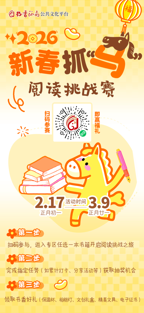 新春添书香,骏马启阅章。为深入贯彻落实《全民阅读促进条例》,推动数字阅读与传统节日深度融合,2026年2月17日至3月9日,由河南省新华书店发行集团主办、书香河南公共文化平台支持的“书香河南‘马’力全开2026新春抓‘马’阅读挑战赛”将面向全国阅读爱好者正式启幕。活动以马年新春为契机,以数字阅读为载体,创新打造“阅读+互动+激励”模式,让书香浸润新春佳节,为全民阅读高质量发展、文化强省建设注入强劲动能。