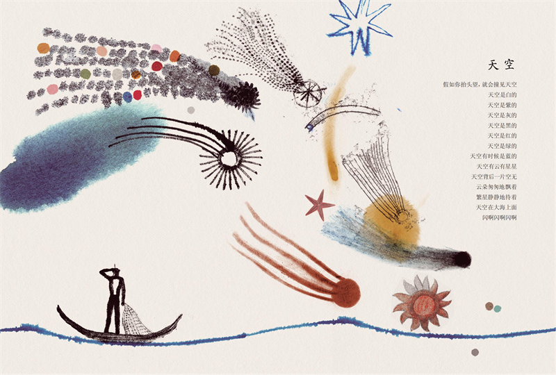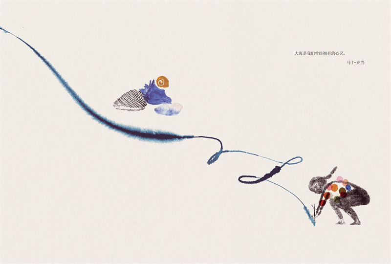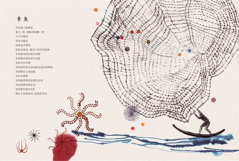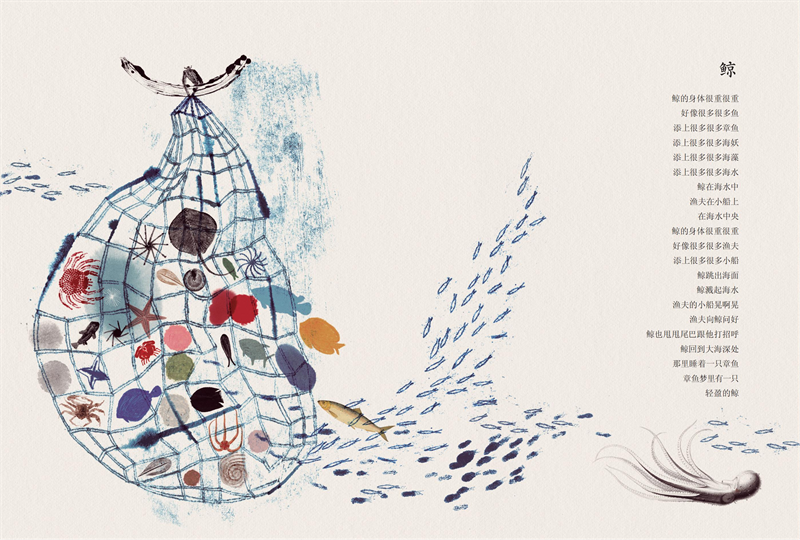 绘本中的童诗描绘了一个以大海为核心的奇妙世界,通过天空、海洋、陆地等空间维度,将星星、云朵、渔夫、章鱼、鲸、海妖、鱼、老虎、小河等意象有机串联,展现了万物共生、彼此联系的和谐画面。诗歌语言充满童真与想象力,意境宁静而温暖,传递出生命之间隐秘而诗意的关联。