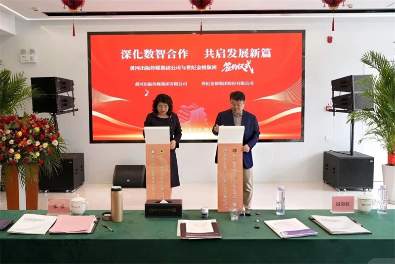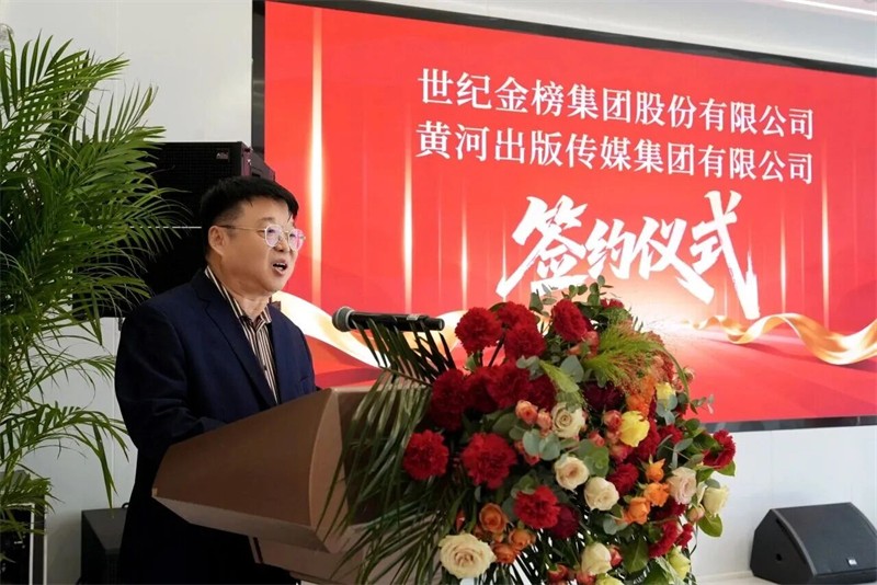 黄河出版传媒集团党委书记陶雨芳、世纪金榜集团董事长张泉分别致辞,黄河出版传媒集团党委副书记、总经理、总编辑赵海虹主持仪式,黄河出版传媒集团党委委员、副总经理孟光永、谢丽,世纪金榜集团营销中心负责人江志光、营销副总高红等世纪金榜集团代表参加签约仪式。