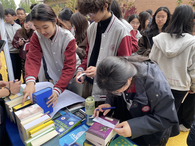 活动现场,天津市出版对外贸易有限公司精心遴选进口原版图书及天津各出版社代表性精品图书近千册,涵盖文学经典、人文社科、自然科学、艺术鉴赏等多个门类,内容兼顾知识性、趣味性与前沿性,充分贴合国际高中学生的多元阅读需求。整齐陈列的图书吸引师生们纷纷驻足,同学们穿梭于展区之中,或俯身细细品读,或轻声交流心得,或认真挑选心仪书籍,全然沉浸在阅读的乐趣之中。