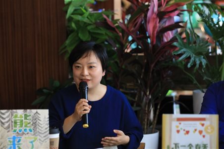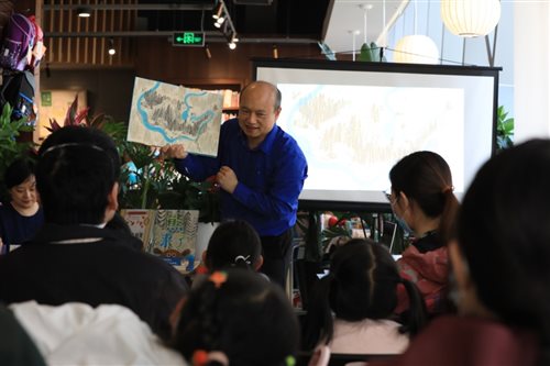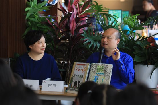 阿甲一向认为,给孩子讲故事一定要读出来,于是在现场朗读一遍《熊来了》。故事从森林的一条小河缓慢开卷,这条小河日夜奔流,不知山中岁月、人间喜乐。直到有一天,一只熊来了,它不小心掉进河中,乘着一根断木顺流而下,它并不知道自己开始了一场冒险。一只青蛙跳到了它的头上,成为它的第一个朋友,接下来它们一路漂流,遇到更多朋友,乌龟、河狸、浣熊、鸭子等等,每个动物都性格分明,并且在漂流中各司其职。
