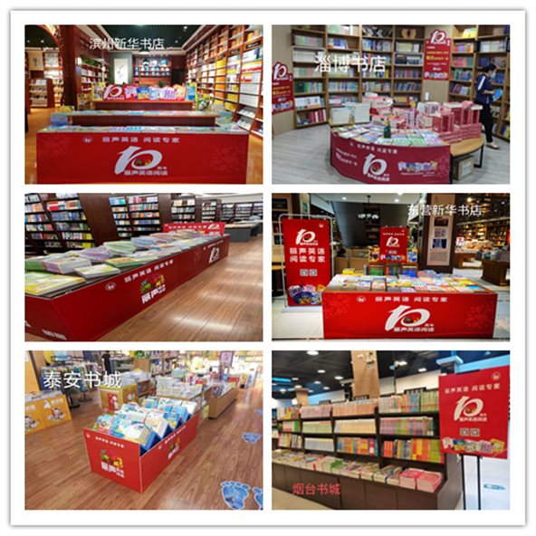 为庆祝“丽声英语阅读”品牌成立十周年,从6月起,外研社联合全国百家书店轰轰烈烈地开展“丽声英语阅读百城万家”活动。各地书店使用统一的红色和丽声英语阅读树作为主视觉,分别设立专台、专柜,甚至专馆,以统一的品牌形象,为读者打造一片英语阅读的单独空间。
