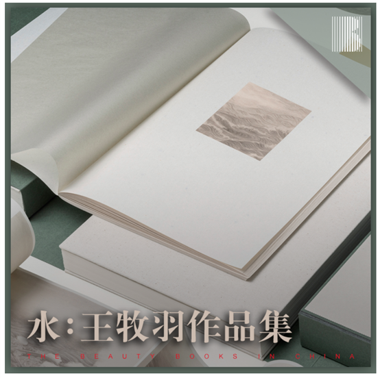 “世界最美的书”评委对《水:王牧羽作品集》的评语:本书专注于高水平的图像再现,没有任何文本甚至页码。图书层层打开,信息和绘画被分为两个独立的册子,互不干扰。尽管每个页面的布局不同,但经折装的页面一旦展开,就呈现出流水的画面。不同的水面仿佛连接在一起,但不仅是水面相连,这本书完全展开,书页的长度和厚度形成了海面的起伏,有一种流动感。另一方面,索引的结构和内容对主体提供了很好的指南和解释,显而易见,它们都面朝着大海。本书的精美印刷很好地还原了艺术家的原作。绿色函套边缘模切的波浪如同平静的水纹,静静地等待被打开。