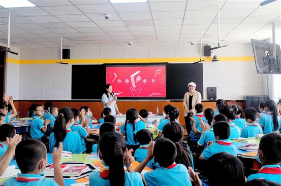 ▲全国人大代表、农民作家马慧娟为原隆村回民小学的同学们带来阅读分享课(摄影:徐晴)