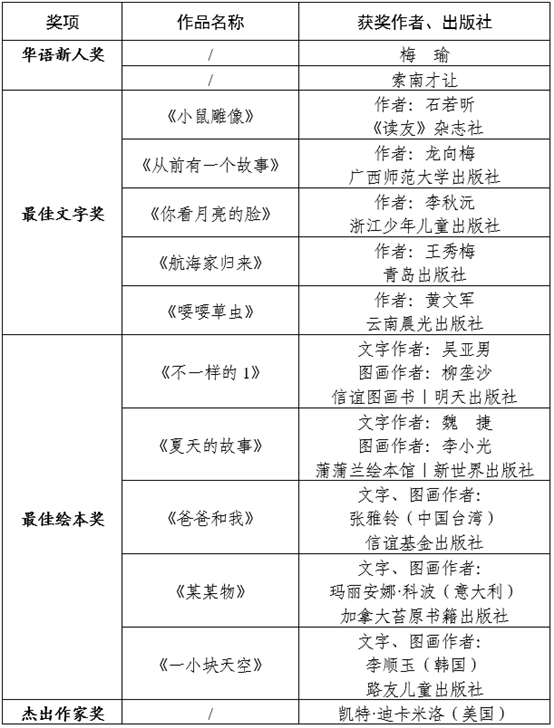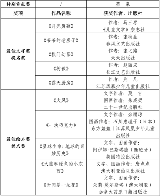 因在儿童文学创作领域取得了优秀成果,美国著名儿童文学作家凯特·迪卡米洛荣获本届文学奖“杰出作家奖”;中国资深绘本画家蔡皋因在中外儿童文学交流、推广和发展等领域做出了卓越贡献,荣获本届文学奖“特别贡献奖”。著名儿童文学作家梅瑜、蒙古族儿童作家索南才让荣获本届文学奖“华语新人奖”。