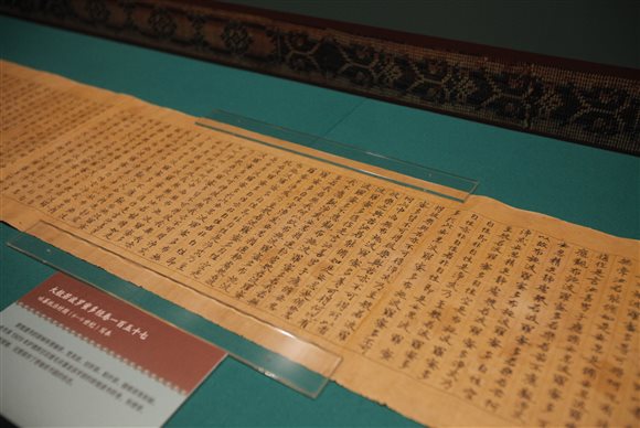 1909年护理陕甘总督毛庆蕃呈送清学部的样卷《大般若波罗蜜多经卷一百五十七》,它完整保存了卷轴装书籍的形态。