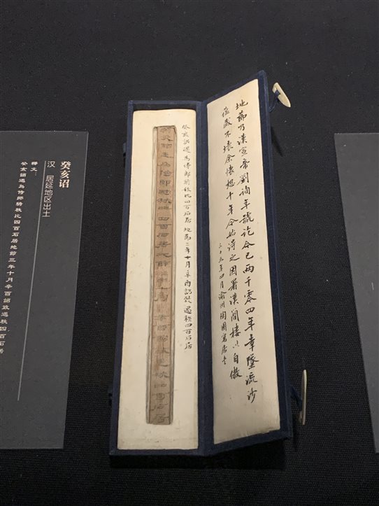 “居延汉简”专题展出展品总计81种,155件。其中甘肃简牍博物馆馆藏共73种,147件,原件48件,仿制品99件;国家图书馆馆藏8种,8件。亮点展品包括甘肃简牍博物馆藏《塞上烽火品约》(仿制品)、《论语·知道》(仿制品)等,国家图书馆藏《“肩水金关”简》《癸亥诏》。20世纪30年代在居延地区发现的第一批一万余枚汉简,现绝大多数藏于中国台湾。其间流散出四、五十枚,国家图书馆收藏有两枚,根据“肩水金关”简文可确定为居延汉简。本专题中另展有一枚70年代居延地区出土的现甘肃简牍博物馆藏“肩水金关”简,两枚分属两批出土的“肩水金关”简在本次展览中得以重聚一堂;《塞上烽火品约》1974年8月出土于甲渠候官遗址第16号房址内,它是匈奴入侵居延时,根据不同情况发出警报信号的规定,示警办法包括了举示烽火、燃烧积薪等。
