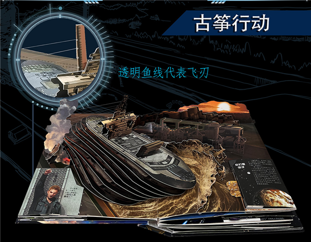 在创作过程中,该书充分发挥了立体书的优势,带领读者领略三体宇宙的奇妙之处。书中不仅内含一百六十多个零部件、十余处互动机关,更创新运用了凹凸镜片、PVC胶片、夜光油墨、鱼线、烫镜面银、光栅等丰富的材质,力求全面提升读者的感官体验。如在“古筝行动”的场景中,以透明鱼线呈现书中纳米材料制作的“飞刃”,通过翻开书页,逐步还原出庞大的“审判日”号巨轮穿过飞刃,一步步被切割并毁灭的过程;在“三体星毁灭”的场景中,三体星的其中一颗恒星被未知文明发射的一颗光粒击中,三体星遭到毁灭,这里使用夜光油墨展现广袤无垠的黑暗宇宙中的浩瀚星辰,一种文明消亡的悲怆苍凉感油然而生。