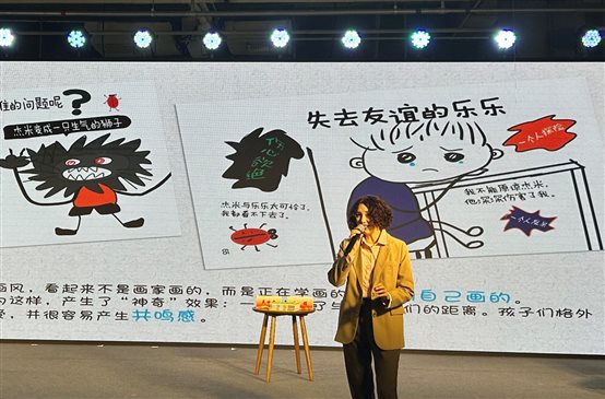 在讲座中,吴甘霖为大家绘声绘色地讲述了《聪明儿童方法书》中的五个小故事,生动的语言和幽默的漫画牢牢抓住了活动参与者的注意力。主人公杰米的故事,仿佛就发生在孩子身边,甚至就是孩子经历过的事,杰米的困境也是许多孩子正在遭遇的困境。随着杰米故事的发展,孩子们也跟杰米一起学到了在沟通、思考、行动、学习、交友等5 个方面,如何摆脱困境、解决问题的多种方法。