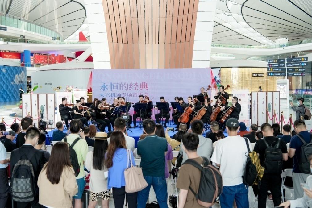 跳动的音符,永恒的经典,交响盛宴飨旅客。5月26日,由首都图书馆和北京大兴国际机场联合筹办的“咏诵经典,乐赞北京”系列文化活动之《永恒的经典》交响音乐会,在大兴国际机场航站楼内成功上演。