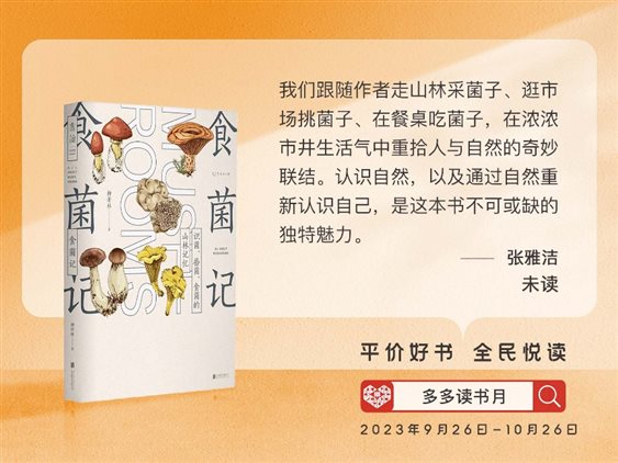 新参加“多多读书月”的图书品牌未读也取得亮眼成绩。未读2021年末入驻的拼多多,主打社科、科普类书籍。“本次我们提报的书是《食菌记》。很多读者对云南的菌子世界并不了解,《食菌记》开启了一次奇妙的食用野生菌之旅,令大家在吃菌子的时候多了一层乐趣。希望未来和拼多多碰撞更多的合作可能。”未读相关负责人说。