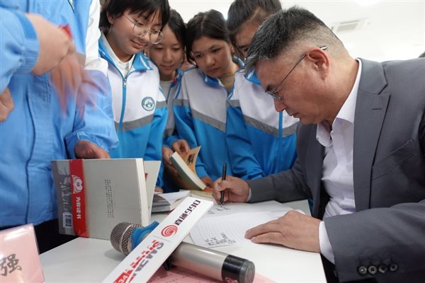 ▲新疆作家协会副主席鞠利为喀什六中的学生们留下寄语 (小巩 摄)