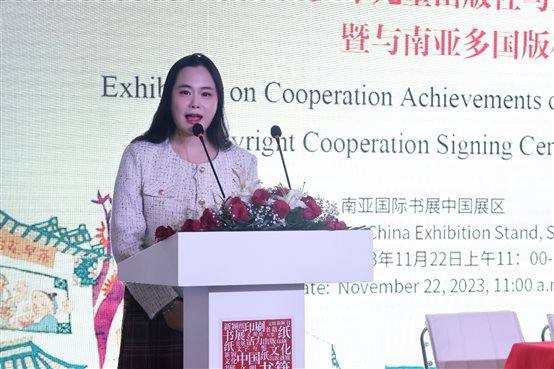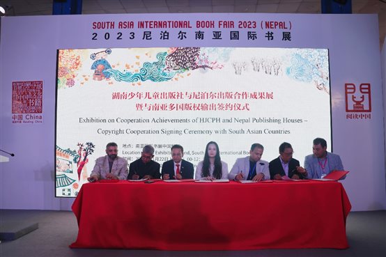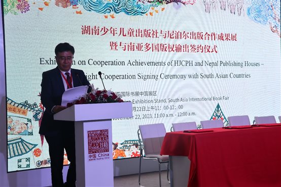 当地时间11月22日上午,湖南少年儿童出版社与尼泊尔出版合作成果展暨与南亚多国版权输出签约仪式在2023南亚国际书展现场举行。湖南少年儿童出版社与尼泊尔、印度、斯里兰卡、孟加拉国,以及埃及的著名出版社,达成中国作品输出五国签约仪式。中国出版协会常务理事、国际儿童读物联盟前任主席、生命树文化促进中心理事长张明舟出席签约仪式。活动由湖南少年儿童出版社国际出版部负责人康沁芯主持。