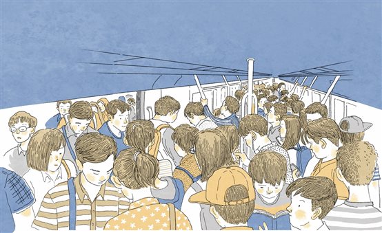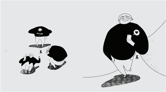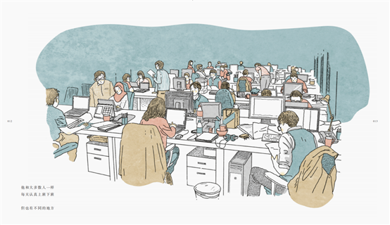 农夫很享受这种孤独,他后退一步,像旁观者那样以局外人的视角,观察着这个五光十色的世界,凝视着那些感到孤独的微妙瞬间。他观察地铁上的人,观察车水马龙的街头,观察繁华都市写字楼中各自为战的“打工人”,观察分手的恋人,观察独处时的自己……一百余幅画面中,既有群像,又有特写,以群像衬托孤单,细致刻画出现代人在日常生活中都曾经历过的瞬间。