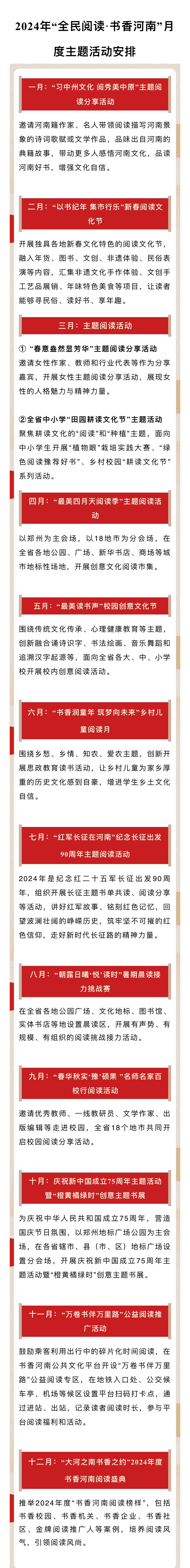 据悉,至今年年底,将陆续在全省范围内开展“习中州文化 阅秀美中原”主题阅读活动、“以书纪年 集市行乐”新春阅读文化节、“春意盎然显芳华”主题阅读分享活动、河南省中小学“田园耕读文化节”主题活动、“最美四月天阅读季”主题阅读活动、“最美读书声”校园创意文化节、“书香润童年 筑梦向未来”乡村儿童阅读月、“红军长征在河南”纪念长征出发90周年主题阅读活动、“朝露日曦‘悦’读时”暑期晨读接力挑战赛、“春华秋实‘豫’硕果 ”名师名家百校行阅读活动、庆祝新中国成立75周年主题活动暨“橙黄橘绿时”创意主题书展、“万卷书伴万里路”公益阅读推广活动、“大河之南书香之约”2024年度书香河南阅读盛典。真正做到一月一主题,月月有精彩。