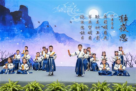 桐乡市伯鸿学校的孩子们身着汉服,吟诵着李白的《静夜思》《古朗月行》,把观众带入古典文化的美妙意境中,也让桐乡市图书馆萦绕在一片书香中。