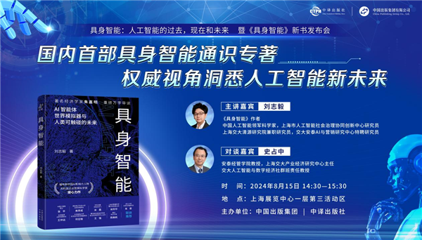 中国出版传媒商报讯 8月15日,由上海书展、中国出版集团中译出版社共同主办的“具身智能:人工智能的过去,现在和未来”暨《具身智能》新书发布会在上海展览中心一层第三活动区举办。中译出版社社长乔卫兵,该书作者刘志毅,上海交通大学安泰经管学院教授、产业经济研究中心主任、数字经济社群班责任教授史占中亲临发布会现场。