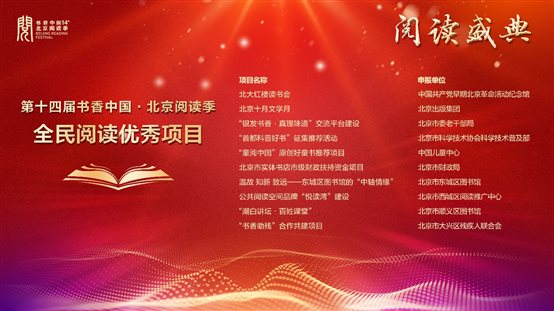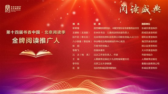 中国出版传媒商报讯 12月5日,第十四届书香中国·北京阅读季阅读盛典在老舍剧场成功举办。活动由书香中国·北京阅读季领导小组指导,北京市委宣传部主办,北京广播电视台承办,北京市文学艺术界联合会和北京出版集团协办,并得到中国出版协会、韬奋基金会和中国音像与数字出版协会的大力支持。来自中国作协、中宣部出版局、北京市委宣传部、北京广播电视台相关领导以及联席单位、北京市16+1区委宣传部的领导,知名学者和媒体代表等近300人参加活动。市委宣传部有关领导出席并致辞。